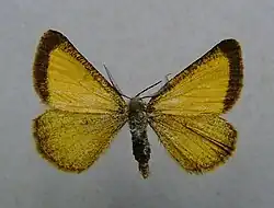 Isturgia limbaria has a wingspan of 26–30 millimetres (1.0–1.2 in). Forewings can reach a length of 13–15 millimetres (0.51–0.59 in).[3] The male has feathered antennae, while those of the females are filiform. The upperside of the wings is yellow or orange yellow with a chocolate brown margin, less evident in the females. The underside of the hindwings is pale yellowish or greyish and strongly mottled, with visible longitudinal white stripes.