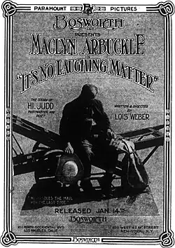 It's No Laughing Matter is an extant 1915 American comedy silent film written and directed by Lois Weber. The film stars Macklyn Arbuckle, Cora Drew, Myrtle Stedman, Charles Marriott, Adele Farrington, and Frank Elliott. The film was released on January 14, 1915, by Paramount Pictures.[1][2]
