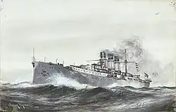 Her propulsion system consisted of two vertical four-cylinder triple-expansion steam engines, each driving a screw propeller. Steam for the engines was provided by twenty-eight coal-fired Babcock & Wilcox boilers that were vented into three funnels. The ship's propulsion system was rated at 19,618 indicated horsepower (14,629 kW) and provided a top speed of 22.15 knots (41.02 km/h; 25.49 mph) and a range of approximately 10,000 nautical miles (19,000 km; 12,000 mi) at 10 knots (19 km/h; 12 mph).[1][2][3]