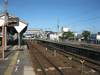 The station consists of an island platform and a side platform serving three tracks. The island platform has an old style tiled roof shelter and serves lines 1 and 2. Line 3 is served by the side platform which has a passing loop/siding running on the other side. The station building is located to the side of line 1. A footbridge from the station building gives access to the island platform and, beyond, to the side platform but a level crossing is also available. The station building houses a waiting room and a JR ticket window (without a Midori no Madoguchi facility). Parking is available at the station forecourt.[2][3][5][6]
