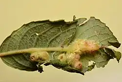 The gall is a coalesced group of 2–10 hard round galls, on the midrib or side vein and are equally prominent on either side of the leaf.[1] Each gall has a single larva, initially white and later orange or red.[2] There is a single generation each year and pupation takes place in the soil.[3] Females prefer to lay their eggs on the ″broad-leaf willows″ and the galls are found on sallows, or their hybrids, which include bay willow (S. pentandra), bitter willow (S. elaeagnos), dark-leaved willow (S. myrsinifolia), eared willow (S. aurita), goat willow (S. caprea), gray willow (S. glauca), grey willow (S. cinerea), purple willow (S. purpurea), tea-leaved willow (S. phylicifolia) and woolly willow (S. lanata).[3]