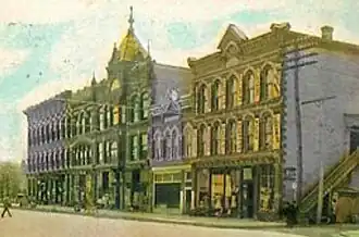 West of the alley on the south side is a 1988 building constructed in a style that complements its neighbors. Nearby is another Late Victorian three-storefront block, with an elaborate bracketed iron cornice. On the north side of the street, four buildings west of the alley retain a generally high degree of integrity. The first building is the oldest in the district, dating from 1875. It has Gothic-arch second-story windows with paneled brickwork, and retains its original iron storefront columns. Next door is a stone-front building with narrow windows.[2]