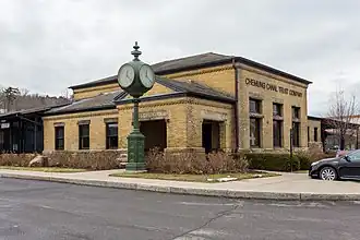It was used as a passenger station until February 4, 1961. In 1966, local resident Joseph O. Ciaschi, an early local leader in the historic preservation movement,[4] converted the abandoned building into a restaurant.[5] Known as The Station, the restaurant operated until September, 2005, when it was closed and the building was converted for use as a branch office of the Chemung Canal Trust Company: an Elmira-based bank.