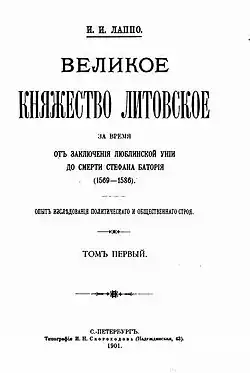 Except for his mid-term treaty on the Tver county in the 16th. century[14] all Lappo's works have been dedicated to the Grand Duchy of Lithuania. Following minor detailed treaties on juridical establishments, published in the 1890s,[15] his first major work was the graduation dissertation Великое княжество Литовское за время от заключения Люблинской Унии до смерти Стефана Батория (1901), a legal-political study on the regime of the Grand Duchy between 1569 and 1586. It was followed by the PhD thesis Великое княжество Литовское во второй половине XVI столетия (1911), which extended the analysis until the end of the 16th century. A spate of more focused analytical articles followed in the 1910s; they dealt mostly with various aspects of the Lithuanian juridical and legal system, usually with regard to the eastern voivodships of Vitebsk and Polock.[16]