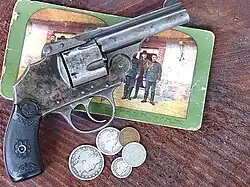The Lovell Swift Hammer & Hammerless was a double action 5-shot .38 caliber top-break revolver made from by Iver Johnson 1890 to 1894 and distributed by John P. Lovell Arms Company of Boston, Massachusetts. It had a nickel finish and was the first Iver Johnson to use the owl's head logo on the grips. In appearance, the Swift model resembles the Safety Automatic Revolver that was introduced in 1894. Some differences include the latch for unlocking the frame pulls down rather than up, the ejector is different, and the Swift model does not have the "hammer the hammer action" of later models. The gun fired a .38 S&W black powder cartridge, and is not safe to shoot with modern smokeless powder cartridges. The hammerless model differed from the hammer model in that it did not have an external hammer protruding from the gun, and it had the addition of a manual safety on the trigger. This feature required the user to place a finger squarely on the trigger to fire the gun.[17] It has the word "Swift" engraved on the top of the gun, and the serial number is stamped under the left grip panel.