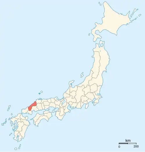 Iwami Province (石見国, Iwami no Kuni; Japanese pronunciation: [iꜜ.wa.mʲi (no kɯ.ɲi)][1]) was an old province of Japan in the area that is today the western part of Shimane Prefecture.[2] It was sometimes called Sekishū (石州). Iwami bordered Aki, Bingo, Izumo, Nagato, and Suō provinces.