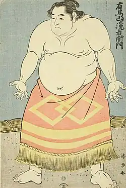 In 1818, he was promoted to the rank of sekiwake and tried to change his shikona to Onogawa to evoke his former master in Osaka. However, he was not allowed to use this name by the Hizen-Arima clan, who were Onogawa's patrons and who had moral authority over the name "Onogawa", and by the Yoshida family, who argued that the Onogawa shikona could only belong to a wrestler who had obtained a yokozuna licence. Instead of Onogawa, he finally adopted the shikona Arimayama Takiemon (有馬山 滝右エ門) and was transferred under the authority of the Nanbu clan.[2] At the time, the change of name was the subject of debate, with some attributing it to a tribute to a hydrothermal mountain not far from his region of origin and others arguing that it was a dig at the narrow-mindedness of the Arima clan, which had refused to give him the name Onogawa.[3]