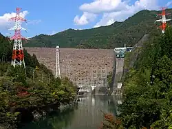 The Iwaya Dam (Iwaya Damu) is a dam in the city of Gero, Gifu Prefecture, Japan on the Maze River, part of the Kiso River system. The dam is a rockfill dam with a height of 127 meters and was constructed as a multipurpose dam for flood control, supply of municipal and industrial water, irrigation water and hydroelectric power generation. The reservoir created by the dam supplies the Chubu Electric Power Company's Mazegawa No.1 Power plant with a capacity of 288 MW hydroelectric power station.[1]