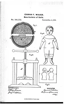 Walker applied for a patent for "a new and valuable Improvement in the manufacture of dolls" on June 12, 1873. She claimed novelty in "the secondary or double stuffing next the external or painted layer, whereby, with a sufficiently soft surface, the tendency of the paint to crack or scale off is obviated."[7] She claimed that a doll manufactured using her patent "is inexpensive, easily kept clean, and not apt to injure a young child which may fall upon it. It will preserve its appearance for a long time, as the soft secondary stuffing under the stockinet or external webbing enables it to give under pressure, so that the oil paint will not scale off. At the same time the inner and more compact stutting prevents ordinary pressure from forcing the surface in to such an extent as to crack the paint."[8] She received her patent, No. 144,373, on November 4, 1873.