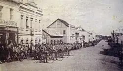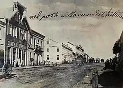 In 1890, the Silveira Martins Street was twelve blocks long.[7] In 1893, the toponym was changed again, honoring the former president of the province Júlio de Castilhos, but it was still called street.[8] Soon after, public lighting began to be installed with gas lamps, replaced in 1913 by electric lamps.[3] At the beginning of the 20th century, the street was still unpaved, but some stretches already had sidewalks, and many residences and other elegant buildings, such as the Scotti and Sassi palaces and the Central Theater, were already visible. In the 1920s, with the implementation of a new Code of Ordinances, new wooden buildings were forbidden in the center, as well as the expansion of existing ones; stricter rules for construction in general and more modern concepts about habitability, comfort, safety and hygiene were also introduced, which influenced the configuration of the buildings. The new regulations also caused the gradual removal of the many industries that had settled in the center and a retreat of the lower class, making the central region a stronghold of the elite and the middle class.[9][7][3] In 1939, Júlio de Castilhos Street became an avenue;[10] at the time, it stretched from João Pessoa Square to Angelina Michielon Street.[11]
