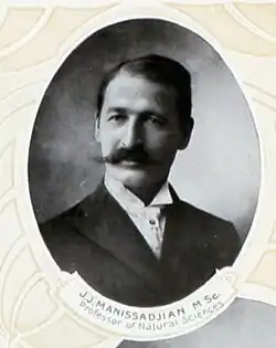 Manissadjian mother, Katharina "Katherine" Margarete Barbara Klein, was German[1] and his father, Barsam J Manissadjian, was Armenian. He studied natural history at the Humboldt University at Berlin.[4] In 1890, he became Professor of Botany at the American Anatolia College in Marsovan (also spelled Mersiwan) in Paphlagonia in Northeastern Anatolia, where he founded a museum.