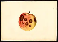 J. Marion Shull began his career with the government as a dendrological illustrator for the U.S. Forest Service (1907–1909).[1] He moved on to work for more than three decades as a botanist and botanical illustrator for the Bureau of Plant Industry at the U. S. Department of Agriculture, first as a botanical artist (1909–1925) and then as an associate botanist (1925–1942).[1] He painted over 750 watercolors of nuts, fruits, and other botanical specimens, including walnuts, pineapples, figs, and especially citrus and apples for the USDA.[2] He was a fruit disease investigator for the department, and many of his illustrations show specimens affected by disease. At the USDA, he formed part of a select group of illustrators—including Deborah Griscom Passmore, Amanda Newton, Royal Charles Steadman, Ellen Isham Schutt, and Elsie Lower—whose paintings form the core of the USDA's Pomological Watercolor Collection.