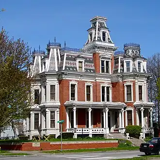 The two-story brick house follows an irregular plan.[3] It features a mansard roof, multicolor slate shingles, wrought-iron roof cresting, brackets, moldings, and fanciful window surrounds. The house is beautifully composed and well executed. It is the ultimate expression of Victorian excess, and it is considered one of the finest examples of Second Empire construction in the state of Iowa.[8]