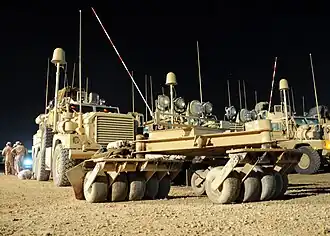 These vehicles are used to safely transport EOD operators, supplies, and equipment,[1] including remotely controlled robots (TALON and PackBot), bomb suits, and explosives. JERRVs are more resistant to the effects of landmines, improvised explosive devices (IEDs), and small arms than soft armored vehicles like Humvees. The JERRV is designed to deflect blasts.[1] They are in some ways like heavier versions of armored cars.