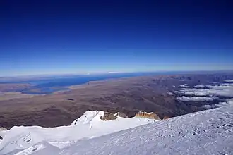 Lake Titicaca as seen from the summit of Janq'u Uma. The mouth of the Jach'a Jawira is visible in the left edge of this image. | |