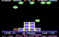 The game was developed by students Kevin Kieller and John Traynor for the VIC-20 and originally named Cubic Critters. After showing the game to Commodore sales reps at a computer show they were invited to the company's Toronto offices to strike a publishing deal. Commodore felt the name was too close to Q*bert and after being unable to settle on a new name, the writers asked the Commodore team to name it. The game was then renamed as an in joke after the company's founder Jack Tramiel. Kieller said "We were led to believe that certain people at Commodore felt Jack Tramiel looked like the red-face critter when he was upset. According to our Commodore contacts, if Jack Tramiel was upset and yelling at you it was known as a Jack Attack." This was confirmed by Commodore marketing strategist Michael Tomczyk. "He chuckled when we named one of the games Jack Attack, which was an inside joke. Jack was short and round in stature but had a deep booming voice that could shake the walls. I don’t think he realized the meaning of Jack Attack but he knew it was about him. He never said much about it, he just allowed it to happen."[3]