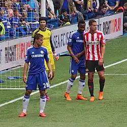 Rodwell made his Sunderland debut, starting a match and playing 68 minutes before being substituted, in a 2–2 draw against West Bromwich Albion in the opening game of the season.[75] On 24 August 2014, he scored his first goal for the club, equalising for Sunderland in their 1–1 draw with Manchester United at the Stadium of Light.[76] Since making his debut for the club, Rodwell became a first team regular in the first four months to the 2014–15 season.[77] This lasted until he missed one match against Crystal Palace, due to a calf injury.[78] Following his return, Rodwell found himself alternating between a starting and a substitute role by the end of the year.[79] On 1 January 2015, he scored Sunderland's first goal in a dramatic match with former club Manchester City with the match ending in a 3–2 loss for Sunderland.[80] On 24 January 2015, Rodwell was sent off after receiving two yellow cards in the FA Cup fourth round against Fulham, in a match that ended 0–0.[81] Between January and March, he found himself out of the first team due to injuries and suspension.[82] His third goal of the season came on 3 March 2015, where Rodwell scored the equaliser in a 1–1 draw away to Hull City, in a match where he was also booked for diving.[83] Despite being on the sidelines on two occasions later in the 2014–15 season, Rodwell continued to be involved in the first team.[84] By the end of the 2014–15 season, he had made 26 appearances, scoring three times in all competitions.