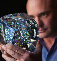Storms specializes in both geometric and representational glass sculptures. Some of his work can be figurative as well as abstract. Storms works with three different types of glass: optical crystal, lead crystal, and dichroic glass. He cuts and stacks slivers of dichroic glass and glues them with a two part epoxy to achieve a "floating core look," he then layers optic or crystal glass around the first structure, then hand sculpts it into a specific shape.[8] It can take more than ten weeks to produce one piece.[1] He uses the Fibonacci theory at the core of every one of his designs.[2][6]