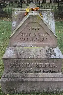 Kemper supported the Oxford Movement, although he maintained the importance of separation from the Roman Catholic Church. He ordained James De Koven as a priest in 1855, and supported Benjamin Onderdonk during his trial. In 1846 Kemper purchased a property adjacent to Nashotah House where he lived the rest of his life. From 1847 until 1854, Kemper served as Provisional Bishop of the newly formed Diocese of Wisconsin, and then served as its diocesan bishop from 1854 until his death in 1870.[3][6] Kemper also supported creation of a new diocese, though he did not live to see the formation of the Diocese of Fond du Lac come to fruition.[7]