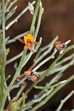 Jacksonia rhadinoclona, commonly known as Miles dogwood, dwarf dogwood or western dogwood,[2] is a species of flowering plant in the family Fabaceae and is endemic to inland areas of eastern Australia. It is an erect to spreading, spindly shrub with greyish-green branches, the leaves reduced to dark brown, egg-shaped scales pressed against the surface, yellow-orange flowers with red markings, and woody, densely hairy, oval pods.