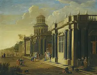 As was common practice in Antwerp artistic practice of that period, Peeters collaborated with other artists. A pair of paintings depicting Fantastic courtly architecture with staffage (Hampel Munich auction of 25 September 2014, lot 679) constitute a collaborative effort of Peeters and Hendrik van Minderhout.[9] Van Minderhout was a Dutch painter active in Antwerp who often contributed the figures to works by local landscape and perspective painters including Wilhelm Schubert van Ehrenberg.[10] The aforementioned pair of pictures, which were made to be hung next to each other, demonstrate the fantastic, almost surreal, aspects of Peeters' imaginary views. One of the canvases provides an idealized view of a palace with round arched loggias supported by columns and the other of a courtly façade with a portico and a balustrade on top. The buildings are placed respectively on the left and right and disappear in the distance with foreshortening at the rear. Each painting continues onto a view of an idealized park landscape with a large pond on which float pleasure ships with swans as figureheads. The backdrop is a blue sky with brightly lit, white-gray clouds. The artist enlivened the scene by having light fall through the loggia arches, which contrasts with the architectural façade, which is in the shade. Groups of figures in the foreground include ladies and gentlemen who are as fanciful as the architecture. The figures are shown in theatrical, stage-like postures, some engaged in conversation. The ladies have towering hairdos and the gentlemen wear turbans or feathered helmets. A black servant carries the train of one of the ladies' dresses. A guard holding a lance is reclining against the façade of one of the palaces. Some dogs are running among these figures.[9]