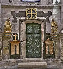 During a Jacobean holy year, pilgrims may enter the cathedral through the holy door (Porta Santa) to gain a plenary indulgence.[8] During a holy year, the lantern of the Berenguela Tower is lit throughout the year. otherwise it stays unlit. The light acts as a lighthouse to guide pilgrims to the cathedral during the holy years.[9]