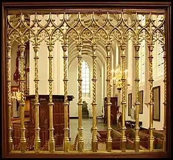The current gothic church dates from the end of the 13th century, but was expanded in the 14th and 15th centuries.[1] In 1576-1577 a cannon was installed in the church tower, aimed at Vredenburg (castle) where the Spanish soldiers there were under siege by the Utrecht schutters.[1] Around 1580 the church endured the protestant reformation and in 1586 it was formally handed over to the protestants, who whitewashed the wall decorations and removed the altarpieces.[1]