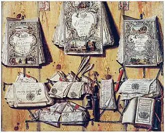 Curled-up sheets, shadow effects and deliberately placed nails enhance the illusionistic effect. In some works a letter appears to have been recently torn open or a red seal freshly broken. The naturalism is further expressed by the seals stamped in red or dark green lacquer and the stretched ribbons in the form of a grid, behind which the objects are stuck. Writing utensils such as goose feathers and matching leather tubes, inkwells, penknifes, playing cards with figurative representations and bars of sealing wax are also depicted. The works contain a collection of random objects and for this reason such compositions are referred to in art history as quodlibet paintings. The Latin word 'quodlibet' means 'what you like'.[1]