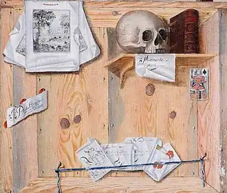 Some of his works clearly have a vanitas meaning. The genre of vanitas still lifes offers a reflection on the meaninglessness of earthly life and the transient nature of earthly goods and endeavors. This meaning is conveyed in these still lifes through the use of stock symbols, which reference the transience of things and, in particular, the futility of earthly wealth: a skull, soap bubbles, candles, empty glasses, wilting flowers, insects, smoke, watches, mirrors, books, hourglasses and musical instruments, various expensive or exclusive objects such as jewellery and rare shells. In the Trompe-l'œil still life with a skull the vanitas meaning is expressed by the presence of the skull and the words memento mori (Latin 'remember that you [have to] die') below it.[5] The portrait of King Charles I of England, who fell from power and was executed, in the Trompe-l'œil painting with an engraved portrait of King Charles I is an often used symbol in vanitas paintings to express the precariousness of worldly status and position.[1]