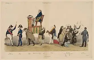 From left to right: The sparger, general Georges Mouton; the deacon, general Jean-François Jacqueminot; a president straddling regulation, Amédée Girod de l'Ain; 1st carrier, Clément-François-Victor-Gabriel Prunelle; 2nd carrier, François Benjamin Levrault; a citizen, King Louis Philippe I, his face hidden by a book; the choir boys, Jean Vatout, Auguste Hilarion de Kératry, Alphonse-Marie-Marcellin-Thomas Bérenger, Antoine Gabriel Jars, Alphonse Jacques Mahul, Hippolyte Ganneron; the subdeacon.