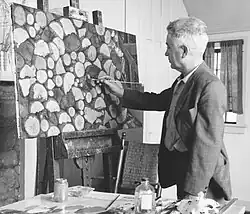 ![]() Jacques Hnizdovsky carving the woodblock "Two Rams" in his studio in New York, 1969 | |