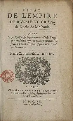 Title page of the first edition of the book by Jacques Margeret entitled Estate de l'Empire de Russie et de Grand Duché de Moscovie