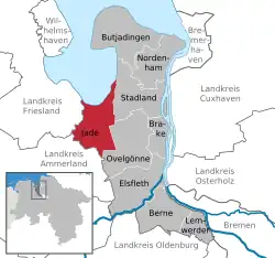Jade (German pronunciation: [ˈjaːdə] ) is a municipality in the district of Wesermarsch, in Lower Saxony, Germany. It is situated on the river Jade, approx. 23 km (14 mi) north of Oldenburg, and 50 km (31 mi) northwest of Bremen.