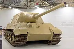 - Jagdtiger (serial number 305004): The Tank Museum in England. One of the 11 Porsche–designed suspension-equipped variants, it was captured by British troops in April 1945 near the armour proving ground at Sennelager, Germany, where it was undergoing testing and trials.[23] The third wheel-station (paired-wheel bogie) on the left side is missing. Zimmerit was applied to approximately 2 meters high on the superstructure and the German Balkenkreuz was painted in the mid-section of the vehicle's casemate's side. The earlier 18-tooth drive-sprocket version is found on this vehicle (later vehicles had 9-tooth drive sprockets).