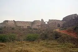The fort was also known as ‘Muhammadabad’, but inferred as a latter-day development.[4] The two gates on the southeast and southwest of Adilabad fort had chambers at the lower level while the east and west gates had grain bins and courtyards at the upper floors. The fortifications built, linking with the other two city walls, was 12 m (39.4 ft) in thickness and extended to a length of 8 km (5.0 mi). Another smaller fortress, called the Nai-ka-Kot (literally "Barber's fortress") was also built at a distance of about 700 m (2,296.6 ft) from Adilabad, with the citadel and army camps, which are now seen only in ruins.[11]