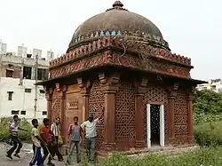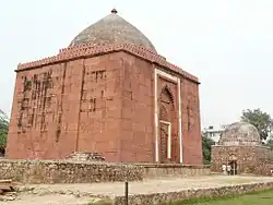 The Lal Gumbad was built as a tomb for Shaikh Kabbiruddin Auliya (1397), a 14th century Sufi saint who served as a disciple of Sufi saint Shaikh Raushan Chiragh–i–Delhi. The dome tomb was built with red sandstone. It is considered to be a small size replica of the Ghiyasuddin Tughlaq’s Tomb in Tughlaqabad.[15] The gateway to the tomb has a pointed arch with marble bands. It is also called the Rakabwala Gumbad as dacoits stolen the finial on the roof of the tomb by climbing up over the iron rungs (called 'Rakab') on its western wall. Apart from these structures, the four walls of a mosque also are located within the compound of the tomb.