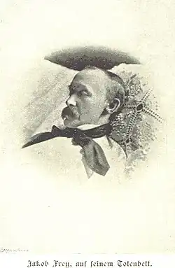 Jakob Frey was born into a large farming family in Gontenschwil. He studied philology and philosophy in Tübingen, Munich and Zürich. From 1851 he lived in Aarau where he edited Der Schweizerbote. He was elevated to the Grand Council of Aargau where he was elected secretary. However this work was unappealing to him and in 1856 he moved to Bern, where he began editing the Berner Zeitung. In 1861 he moved to Basel, and in 1865 he went back to Bern before returning to Aarau in 1868. He died in Bern.