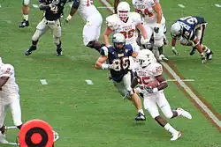 In 2007, Charles rushed for 1,619 yards, with an average of 6.3 yards per carry.[37] Charles started the season with 27 carries for 112 rushing yards and a touchdown in a 21–13 victory over Arkansas State.[38] In the next game, a 34–13 victory over rival TCU, he had 22 carries for 134 rushing yards and a rushing touchdown.[39] In the next game, a 35–32 away victory at Central Florida, he had 22 carries for 153 rushing yards and a rushing touchdown, which put the Longhorns up by two possessions late in the game.[40] In the next game, he had 14 carries for 72 rushing yards and three rushing touchdowns in a 58–14 victory over Rice.[41] Despite his successes early in the season, Mack Brown and Greg Davis hinted that Charles could face less playing time as a result of his fumbling problems.[42] Charles said that he felt a deep remorse over his fumbles and felt that he is the biggest reason the team lost to the Oklahoma Sooners in the 2007 Red River Shootout. Texas running backs coach Ken Rucker and former Longhorn running back Earl Campbell both worked with Charles on his ball handling.[43] Greg Davis said he wanted to get the ball to Charles "in space", on pitches and passes, instead of in heavy traffic up the center.[44]