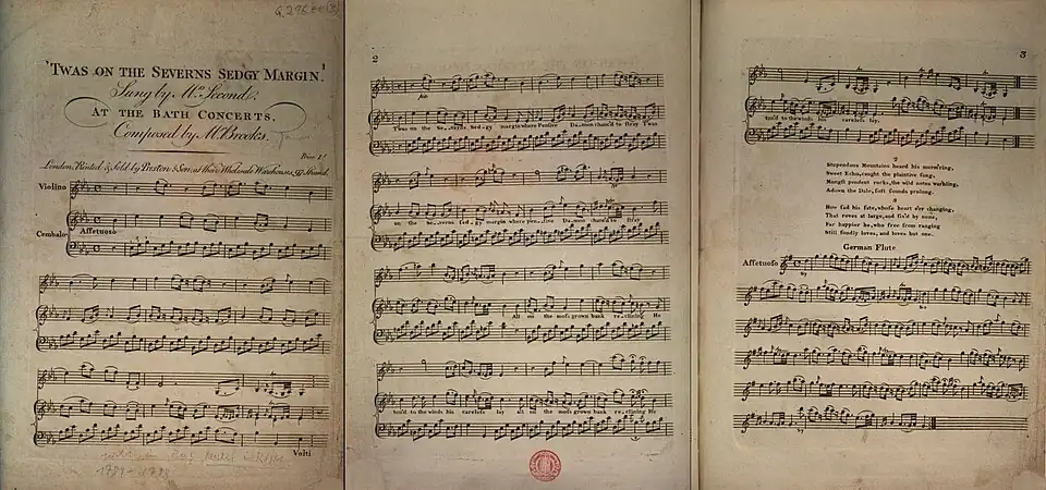 26. ^ Brooks, James (1795). Twas on the Severns sedgy margin. / Sung by Mrs. Second at the Bath concerts, ; composed by Mr. Brooks. London: Preston & Son. British Library: Music Collections G.296.ee.(3.), Music Collections DRT Digital Store G.296.ee.(3.).