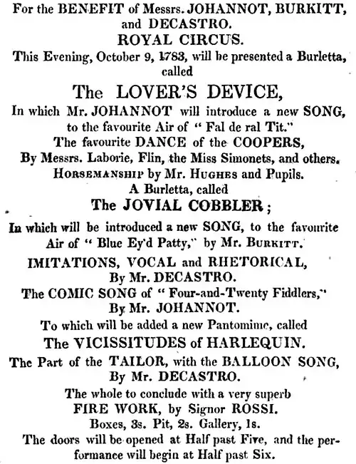 7. ^ Decastro, Jacob (1824). The memoirs of J. Decastro, comedian. In the course of them will be given anecdotes of various eminently distinguished characters... Amongst others are Dr. Johnson, Garrick, Foote,...accompanied by an analysis of the life of the late Philip Astley. Also an accompanying History of the Royal circus, now the Surrey theatre; and an historical sketch of Sadler's Wells. Likewise scarce theatrical advertisements, from Garrick's first attempt in Goodman's-Fields... To which will be added The origin of poetry; A chapter on Bent's, &c... London: Sherwood Jones & Company. pp. 22–23.