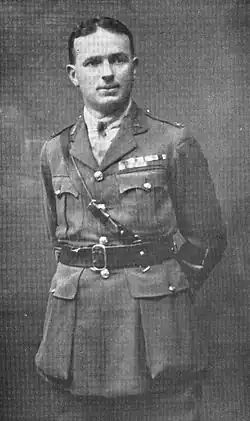 Following the outbreak of the First World War in August 1914 Hargest volunteered to serve in the New Zealand Expeditionary Force (NZEF) and was commissioned as a second lieutenant in the Otago Mounted Rifles. He served in the Gallipoli campaign and was severely wounded during the August Offensive. After several months of convalescence, he returned to active service in July 1916 with the New Zealand Division. Assigned to the 1st Battalion of the Otago Infantry Regiment,[4] he commanded a company during the Battle of the Somme in September 1916.[5] His actions in restoring order in his battalion, when he assumed command of four companies that had suffered heavy casualties following a failed attack on 27 September,[6] saw him rewarded with the Military Cross.[3] The citation for his MC, which appeared in The London Gazette in December, reads as follows: