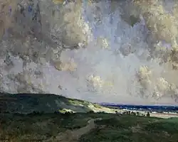 James Humbert Craig was born at 16 Brougham Street Belfast, on 12 July 1877.[3] Soon after his birth his family moved to Ballyholme Road, Bangor County Down. Here they built a house and named it ‘Craigwelyn’ after the last name of the family.[4] Craig was the son of Alexander Craig, a tea merchant working on tea imports in Belfast.[5] His mother, Marie Sabine Metezzen, was a Swiss native coming from a creative family in Lausanne.[6] This is where Craig got his flair for painting, which he began by using the plywood from the sides of tea chests from his father.[5] Metezzen came to Ireland with a school friend from Switzerland who travelled to Belfast to visit his family working in the Belfast ship building industry.[4] She married Alexander Craig in 1874 in Castlereagh Presbyterian Church, Down.[6] James Craig grew up in a wealthy house where he was privately tutored at home in ‘Craigwelyn’.[3] Craig was a fond lover of sports, his favourite being anything to do with the sea. This fascination was carried into his love of art with him later taking a great amount of time painting the Northern Coast of Ireland. Craig enjoyed sailing, swimming and angling with his father, while being a strong player of rugby and football.[3][7] He went on to be one of the founders of the Bangor Rugby Club, hoping to inspire many more young boys to take up the sport. The family later moved to 160 Groomsport Road, to which they named the house ‘Craiglea’, in reference once again to the family name, this house was later demolished in 1986. Craig was a very talented boy, taking a fancy with many instruments and playing with the Belfast Philharmonic Orchestra on occasion.[4] As the only son Craig began apprenticing his father at the age of fourteen, he stayed only for a couple of years before enrolling in the Belfast School of Art to continue his love of painting.[4][7] However, Craig left the college after a term and emigrated to America, he stayed for a short time working small jobs including painting the Brooklyn Bridge while under construction. After witnessing a suicide from the bridge, Craig returned home and began to paint the landscapes he was much more comfortable with - mostly the coast of Ireland.[6]