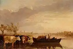 Impressed by the work of David Wilkie, whose Blind Fiddler John Burnet was then engraving, and the Dutch paintings he saw in London, especially those of Aelbert Cuyp and Paulus Potter, James was inspired towards a naturalistic approach in his paintings.[1] He had a studio in Chelsea[3] – his address is given in the Royal Academy catalogues as 26, St. George's Row[4] – and based his landscapes on sketches made in the area around Fulham and Battersea, which was then still largely rural.[2][3] He exhibited at the Royal Academy between 1812 and 1814.[4] Many of his paintings feature cattle. Allan Cunningham wrote: