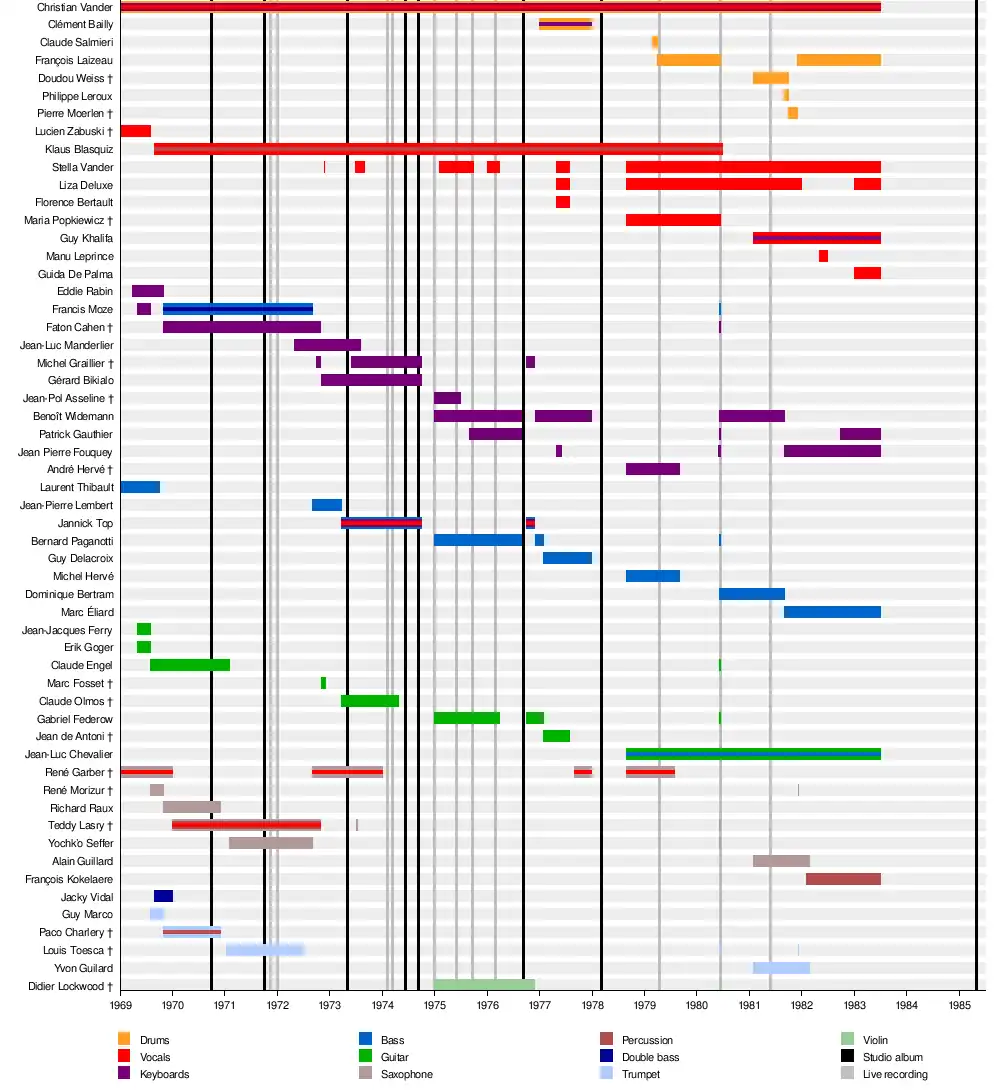 - Drummers and percussionists: Christian Vander, Michel Garrec, Doudou Weiss, Simon Goubert, Clément Bailly, Claude Salmiéri, François Laizeau.[59]