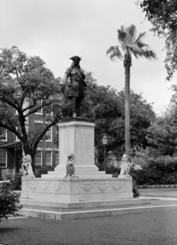 The pedestal for the statue is made of pink-gray marble and was designed in the Italian Renaissance style. The pedestal itself rests on a large square base that has four lion rampants, one on each corner.[16] Each lion is holding a shield that depicts Oglethorpe's personal coat of arms and the seals of the state of Georgia, the colony of Georgia, and the city of Savannah.[1] The base is further decorated with garlands.[16] Part of the original charter granted to Oglethorpe by Parliament is inscribed on the monument,[1] while on the south side of the monument is inscribed the following:[19]