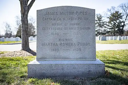 The President of the United States of America, in the name of Congress, takes pleasure in presenting the Medal of Honor to Captain James Milton Pipes, United States Army, for extraordinary heroism on 2 July 1863, while serving with Company A, 140th Pennsylvania Infantry, in action at Gettysburg, Pennsylvania. While a sergeant and retiring with his company before the rapid advance of the enemy, Captain Pipes and a companion stopped and carried to a place of safety a wounded and helpless comrade; in this act both he and his companion were severely wounded. A year later on 25 August 1864, at Reams Station, Virginia, while commanding a skirmish line, Captain Pipes voluntarily assisted in checking a flank movement of the enemy, and while so doing was severely wounded, suffering the loss of an arm.[3]