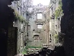 The southern tower was built much earlier than the remainder and includes arrow holes, murder holes, spiral staircases and rounded corners. There are still staircases and different floors remaining in the old, 13th-century tower. However, the remainder, built sometime later, is now in ruins.[4][1]