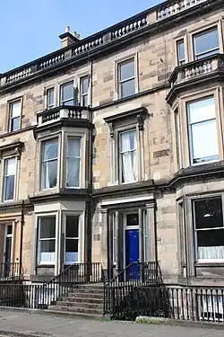 He retired to Edinburgh in 1892 and died at home 16 Grosvenor Crescent[4] on 8 July 1899. He is buried with his wife Elizabeth in Dean Cemetery in western Edinburgh. The grave lies in the northwest corner of the Victorian north extension, against the north wall.