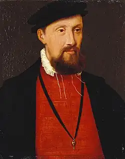 James recovered money from the church by getting Pope Clement VII to allow him to tax monastic incomes.[25] He sent £50 to Johann Cochlaeus, a German opponent of Martin Luther, after receiving one of his books in 1534.[26] On 19 January 1537, Pope Paul III sent James a blessed sword and hat symbolising his prayers that James would be strengthened against heresies from across the border.[27] These gifts were delivered by the Pope's messenger while James was at Compiègne in France on 25 February 1537.[28]