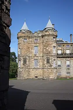 James V spent a large amount of money (at least £41,000) during his adult reign on extensively remodelling all the major residences and several minor ones, including the construction of new structures, with the most significant work focused on Falkland Palace and Stirling Castle.[33][34] Early in his personal rule, James began the construction of the present Late Gothic tower at the north-west corner of the Palace of Holyroodhouse, which provided new royal lodgings on the first and second floors, and a high degree of security. A new west front was also built.[35][36]